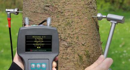 测量原理:在树木的一侧安装上专用螺丝钉,在对面的另一侧安装上传感器,用电子脉冲锤敲击专用螺丝钉后,声音脉冲波穿过树木被传感器探测到,读数表记录相应数据,数据通过USB电缆线下载到安装有分析软件的电脑上,通过分析软件进行数据分析,以分析出树木内部腐烂、空洞、裂隙等等树木内部结构情况。